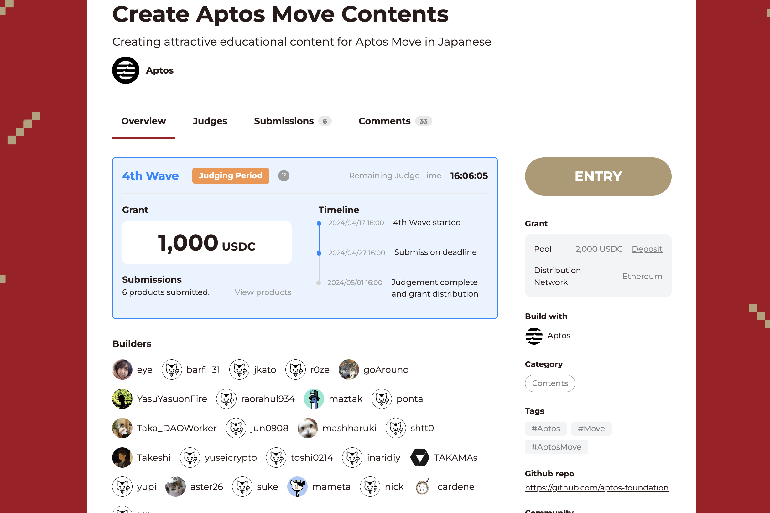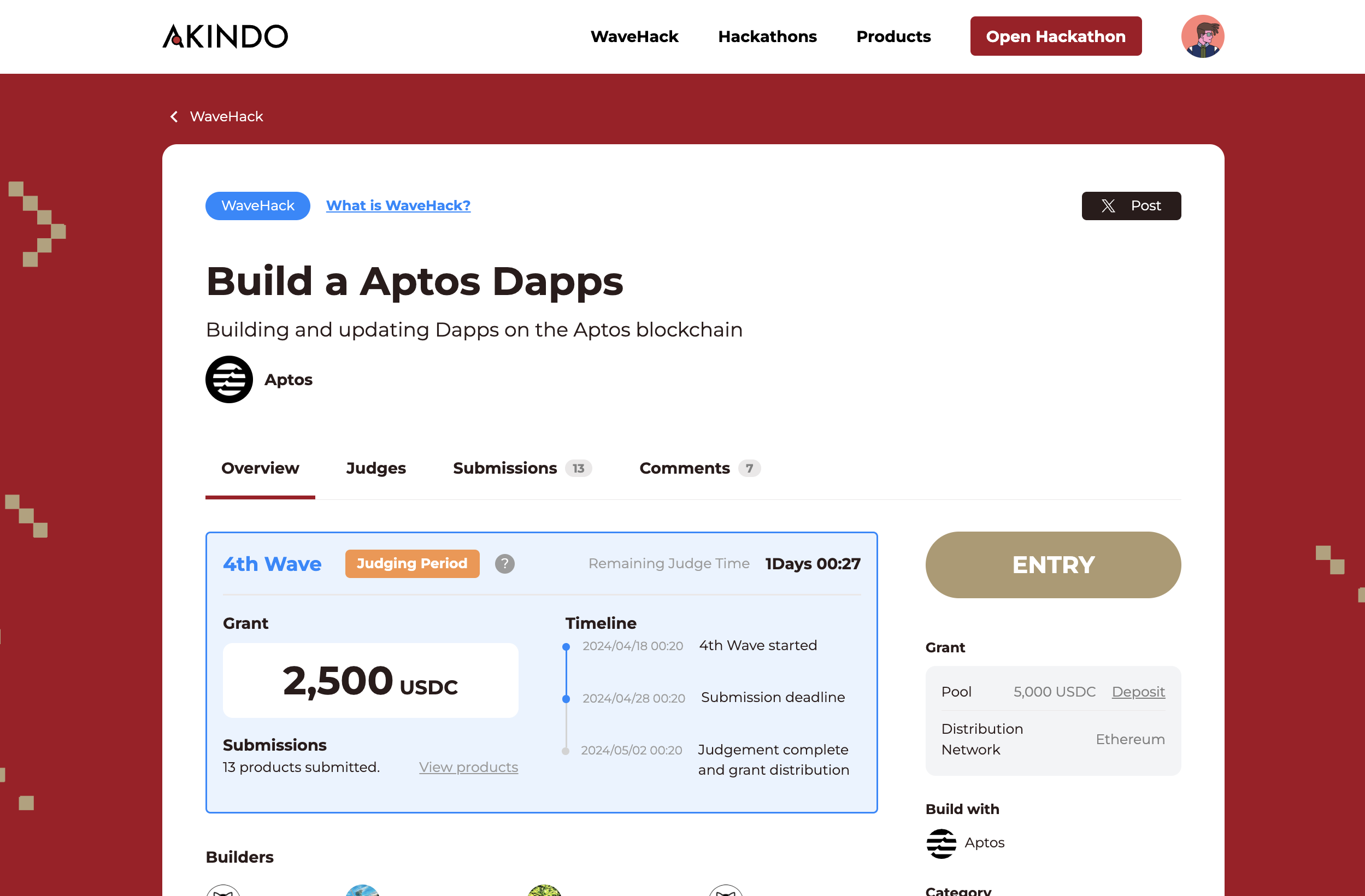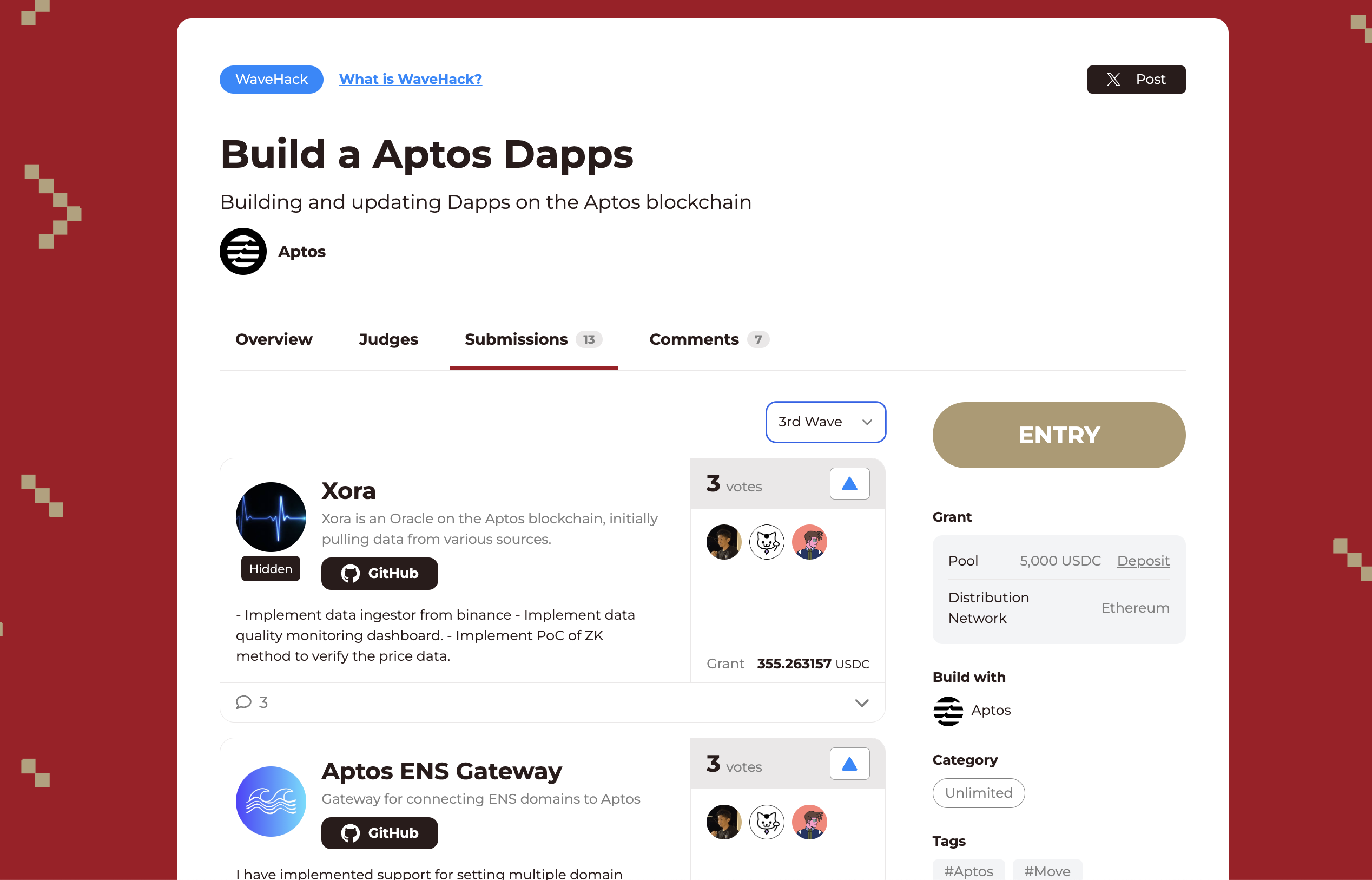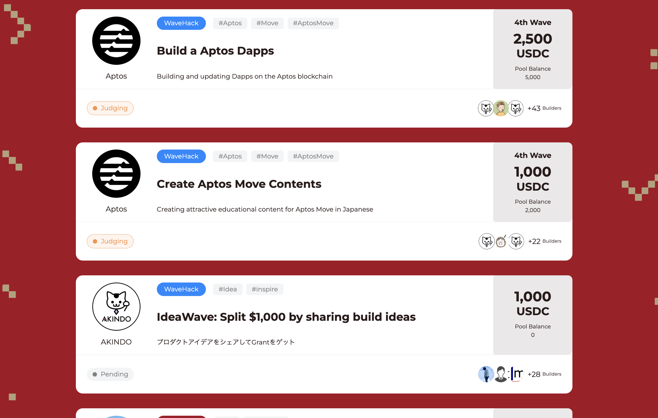 WaveHack is a growing app ecosystem platform for infrastructure projects that is 10x more efficient than hackathons or grant programs. You can retrospectively evaluate the work of teams contributing to your ecosystem and automatically distribute grants to the right builders on an ongoing basis. In short, it will become a tool for on-chain native grant distribution, replacing traditional hackathons and grant programs and becoming the de facto standard for building long-term engagement with the developer community.