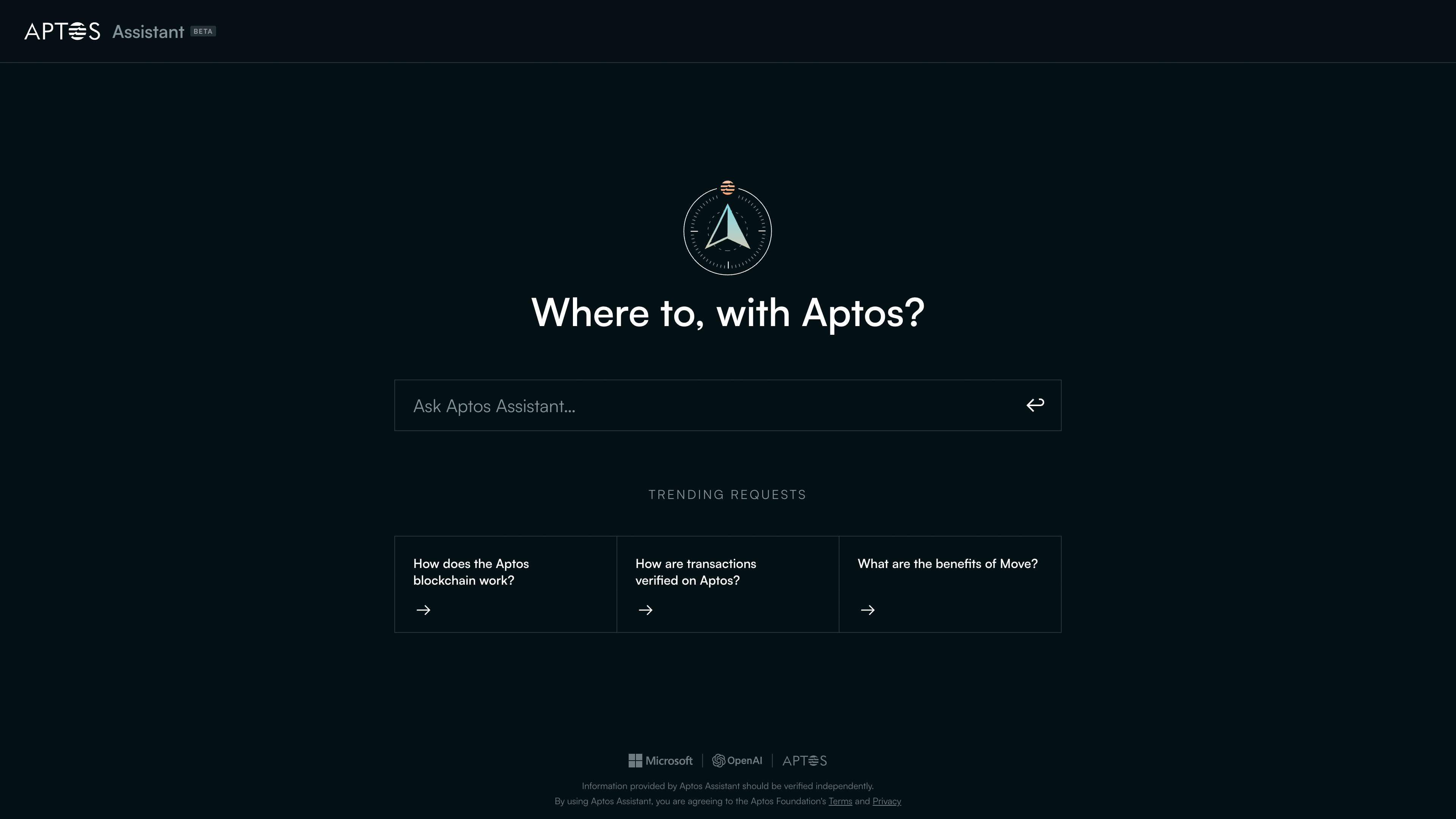 Aptos Assistant integrates advanced OpenAI technology and Microsoft's robust capabilities, offering a streamlined and intelligent experience on Aptos.