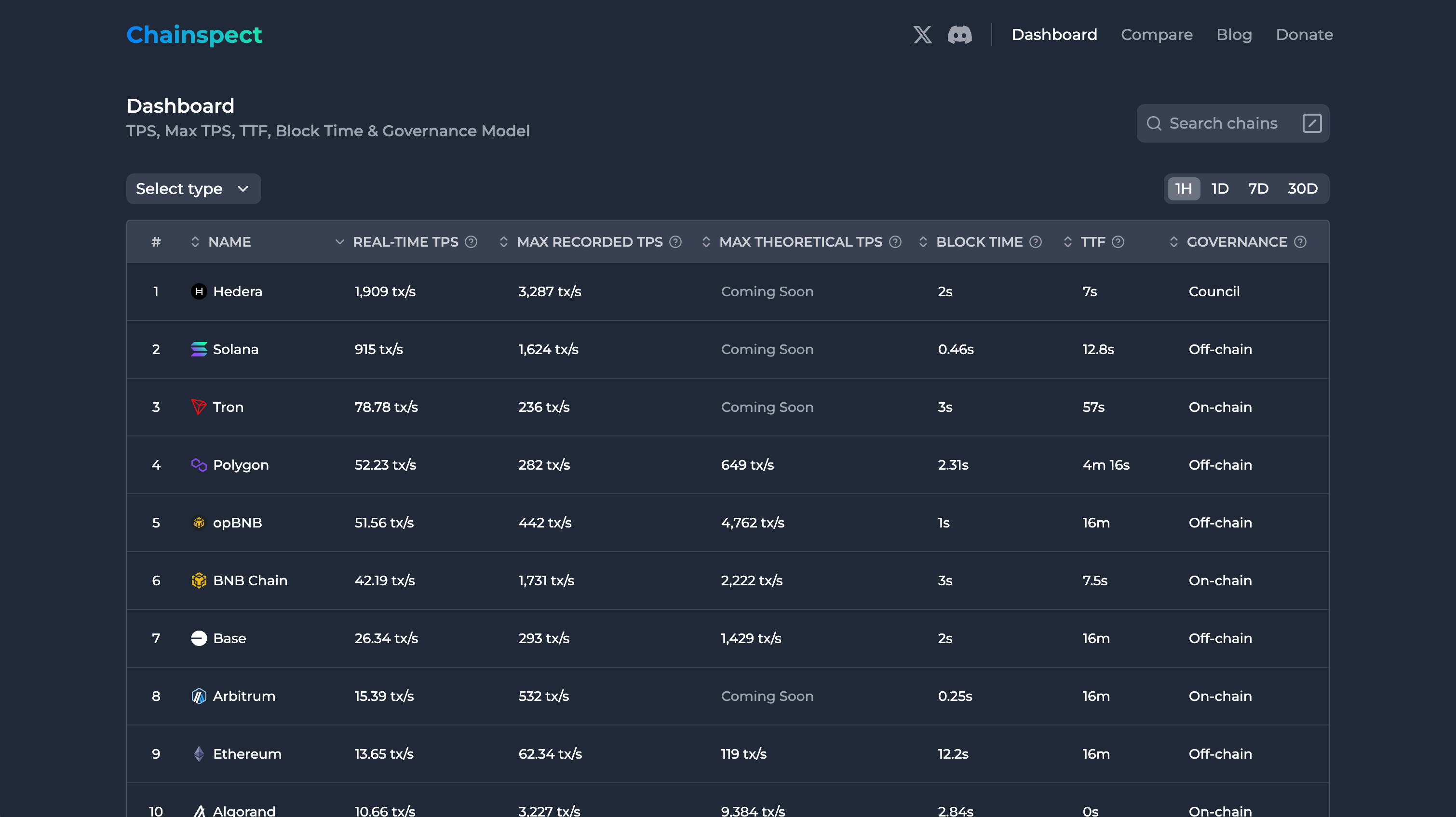 Chainspect is an independent blockchain analytics platform focused on tracking technical metrics for your favorite networks, including Aptos. We track real-time TPS, max recorded TPS, max theoretical TPS, Block Time, TTF, and governance model with more metrics to come. The core of our platform is a dashboard with 30+ chains, but besides that, we have Chain Pages for each network we track and Compare Pages for comparing any two networks side by side.