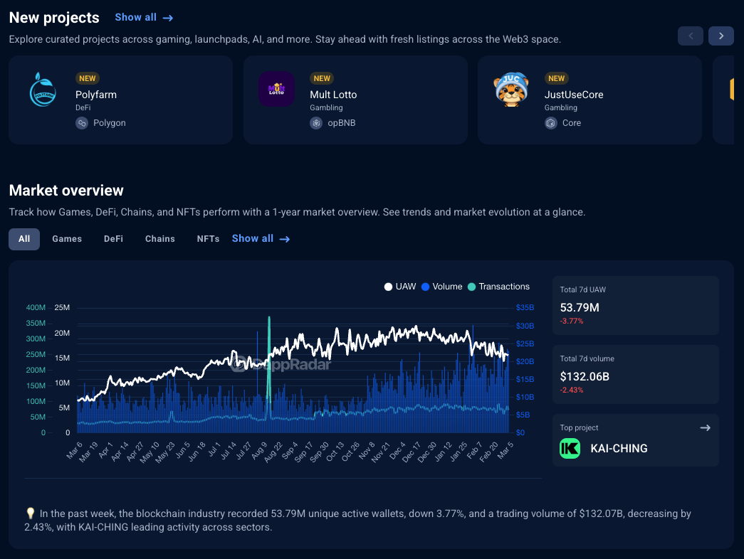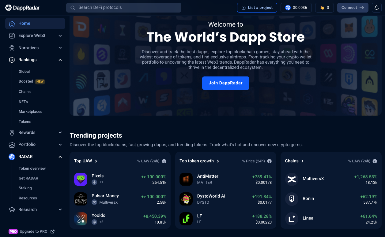 DappRadar, the World’s Dapp Store, tracks 17,000+ projects across 80+ chains in NFT, DeFi, gaming, AI, and more. With on-chain data and insights, we simplify discovery, empowering users to explore, analyze, and make informed decisions in the Web3 ecosystem.