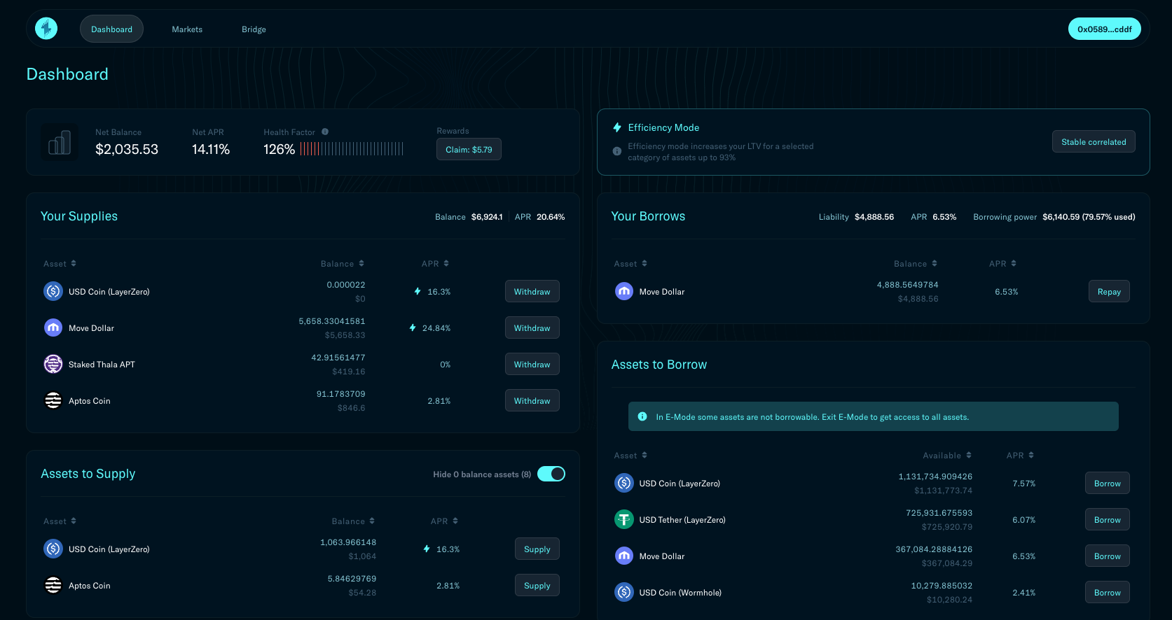 Echelon is a high-efficiency borrow/lend market designed to scale Move DeFi & liquidity. Drawing inspiration from AAVE's E-Mode, Echelon offers unmatched capital efficiency to borrowers with high LTV loans on select asset pairs, such as stables or LST and native assets.