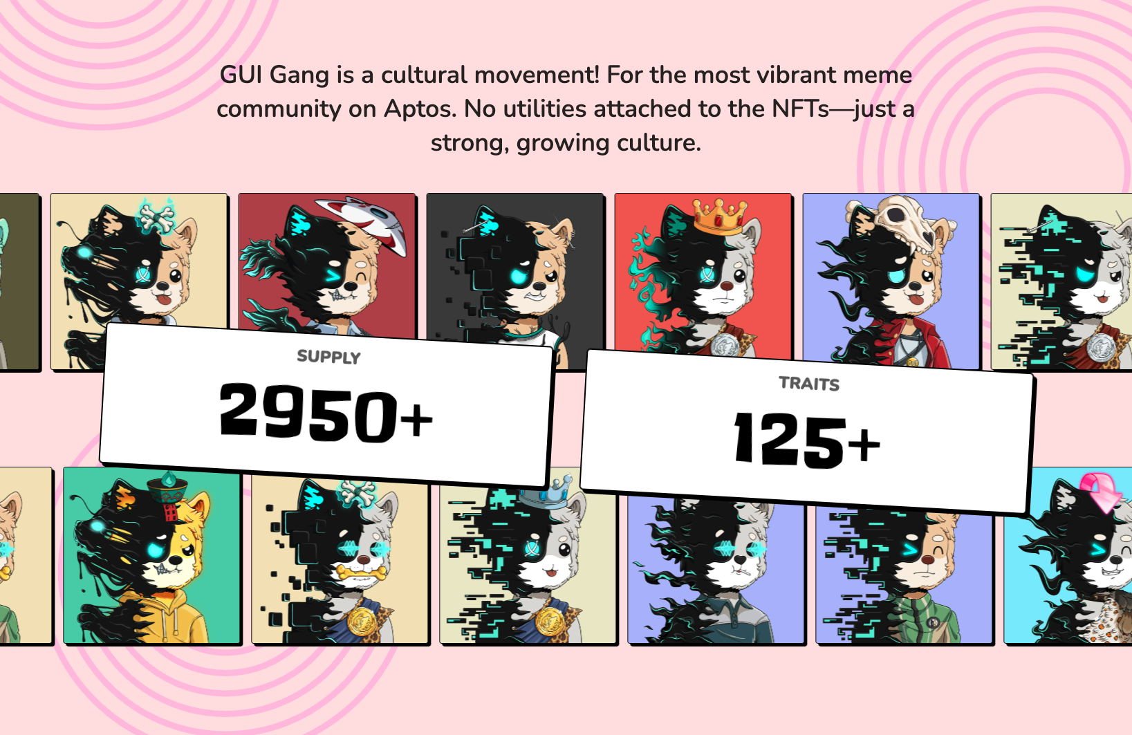 GUI INU was launched in December 2023, a year after Aptos mainnet launch, when the market conditions were challenging, and there was a dire need for a community that carries on the vibes and brings back life to web3 and Aptos. Being one of the best community tokens on Aptos, GUI INU wanted to have an NFT that resonates the vibes that the memes carry, so the GUI Gang mint happened in 2024 and the amount of GUI raised with the mint was doubled and burnt from the supply permanently. GUI Gang has a supply of 3000+ and the utilities are endless - vibes, memes, and opportunities.