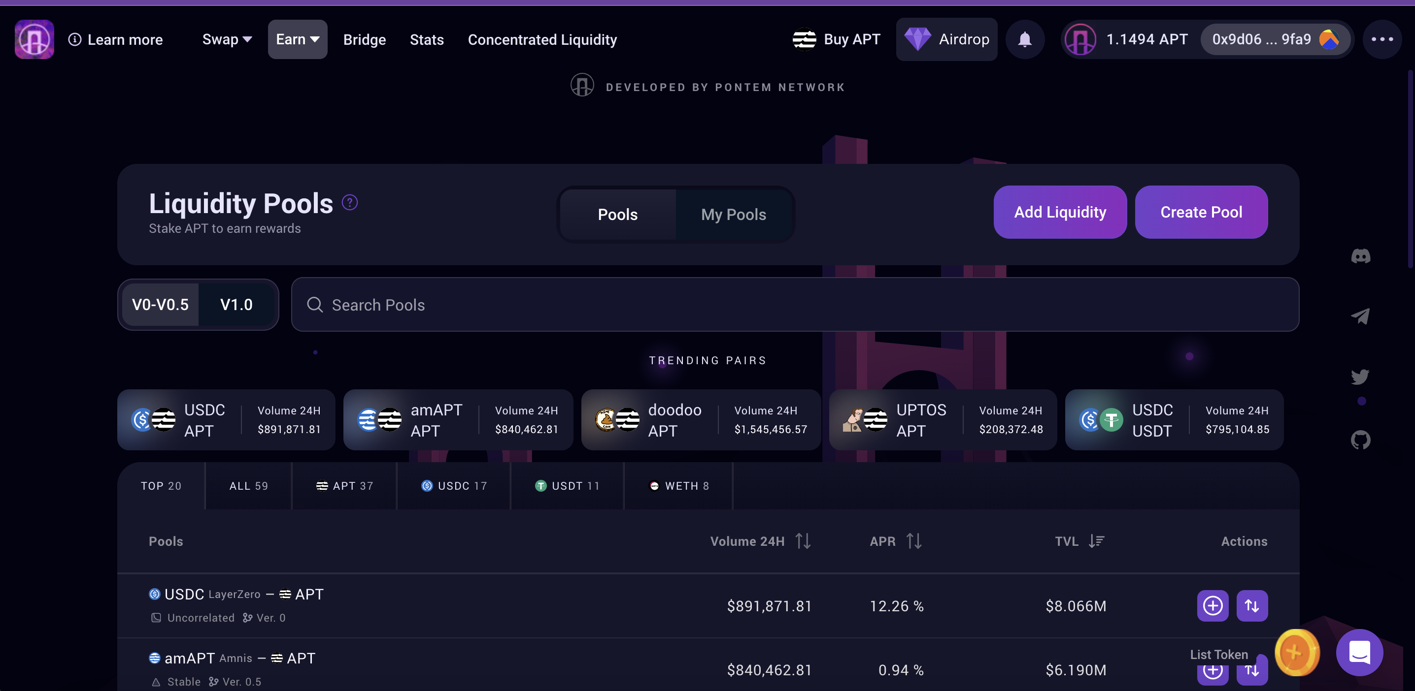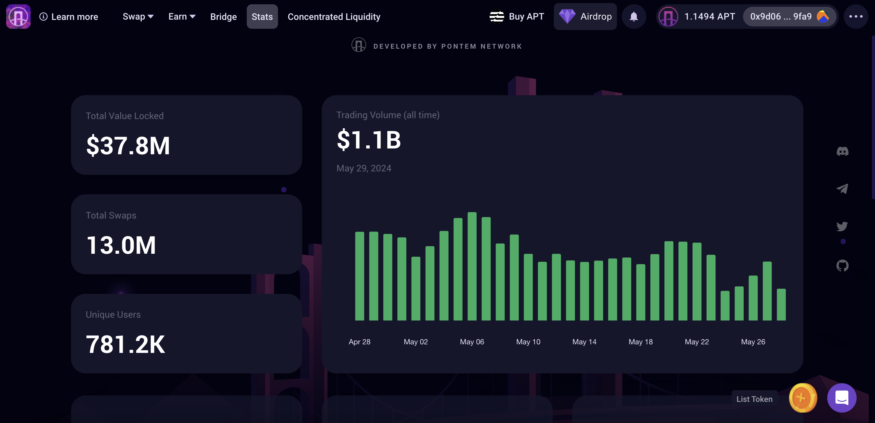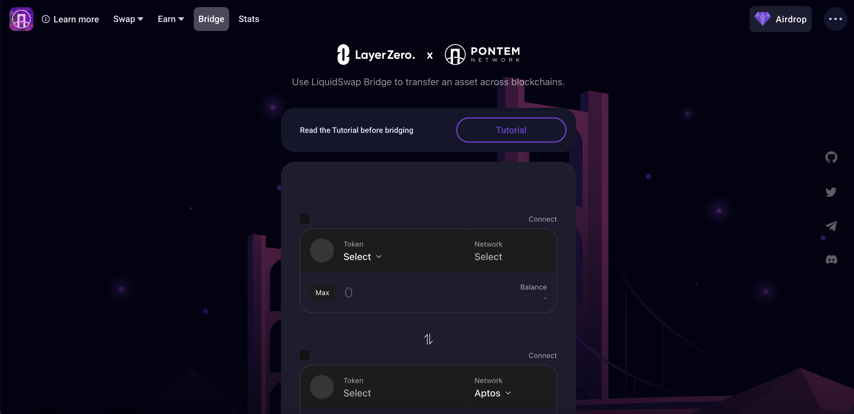 Liquidswap by Pontem is the most popular decentralized exchange (DEX) on the Aptos blockchain. It's built on Move for maximum security, with multiple audits. With Liquidswap, you can swap tokens, and earn through yield farming, staking, and liquidity pools. You can also bridge tokens from one blockchain to another.