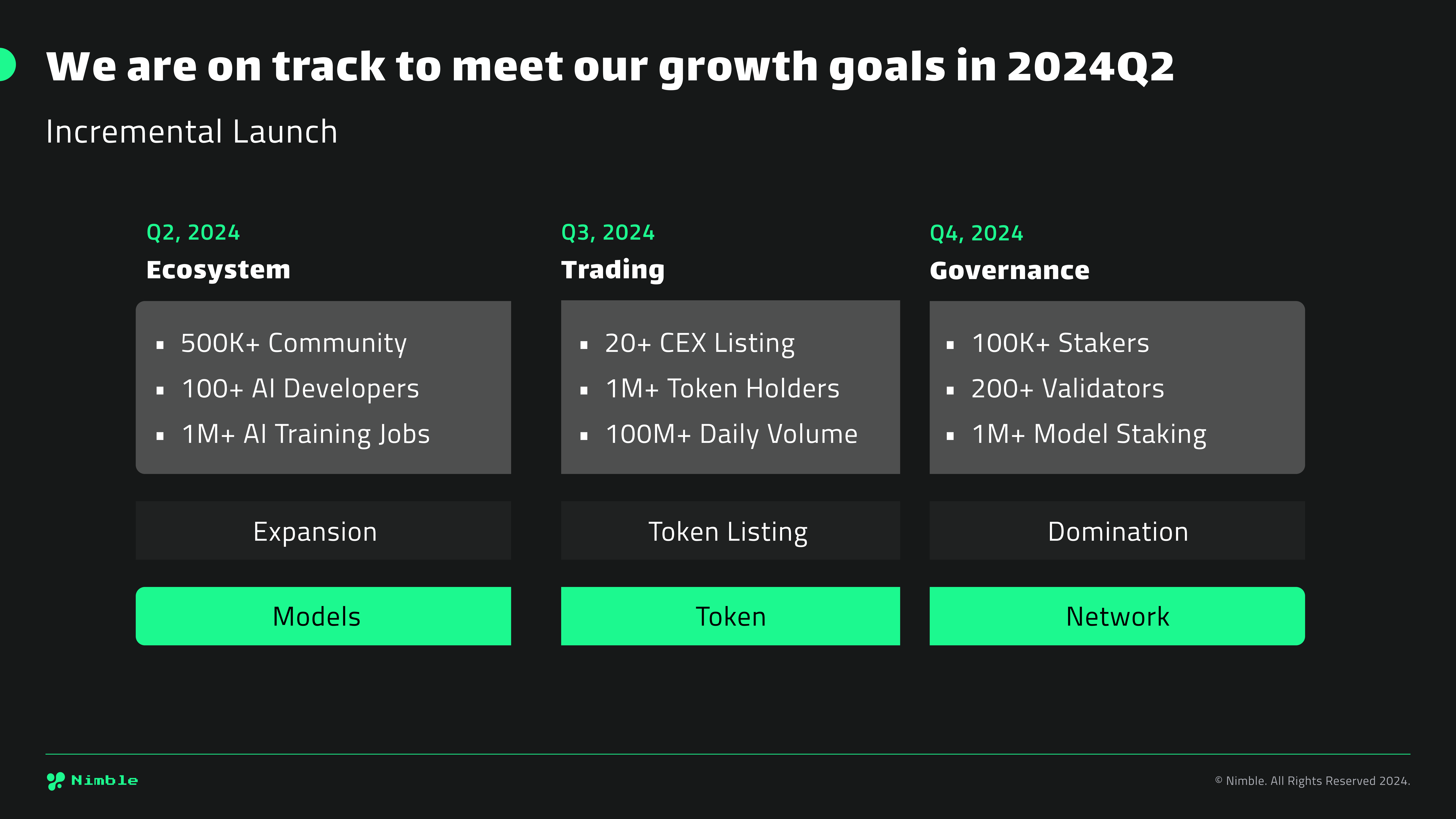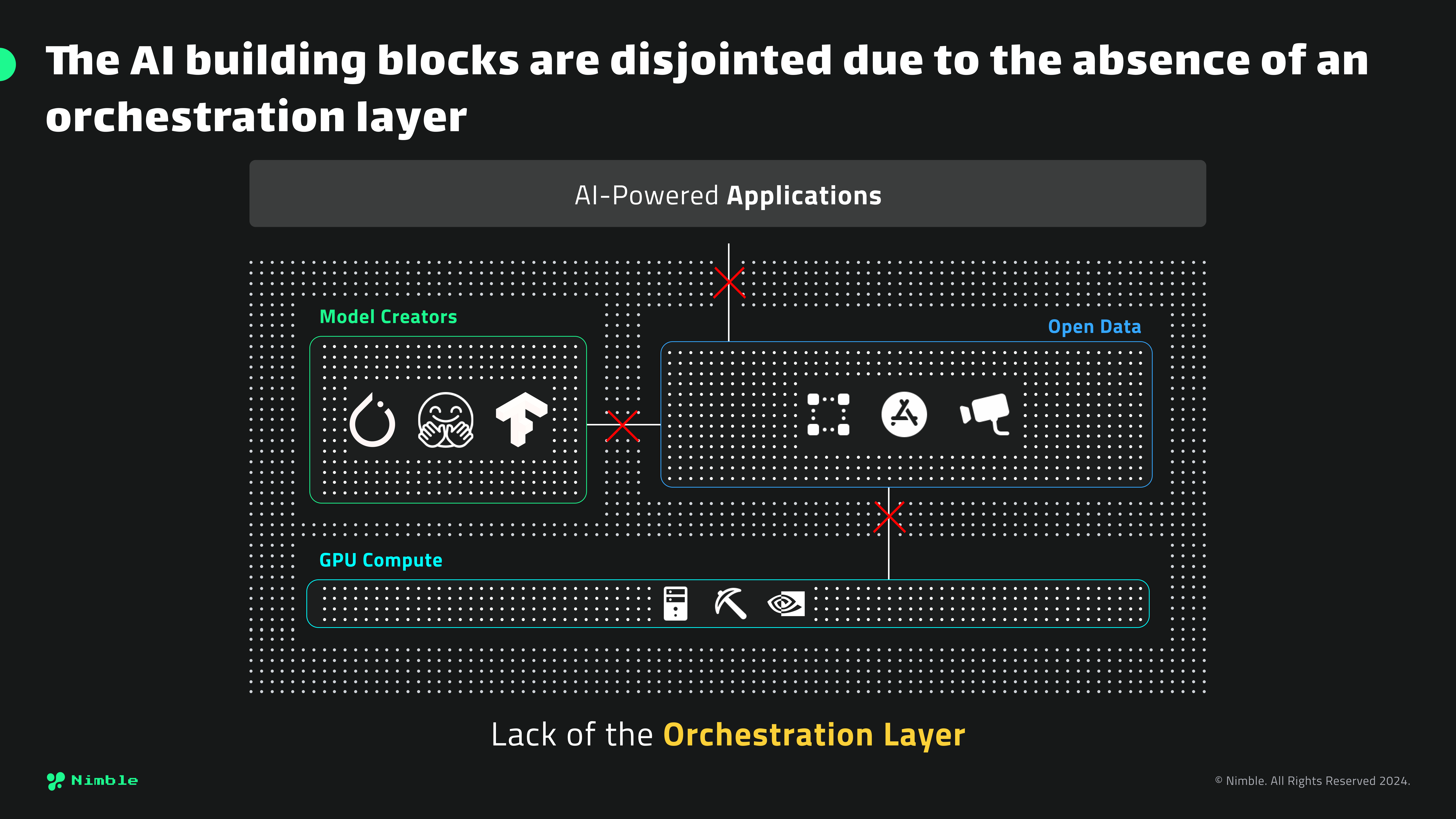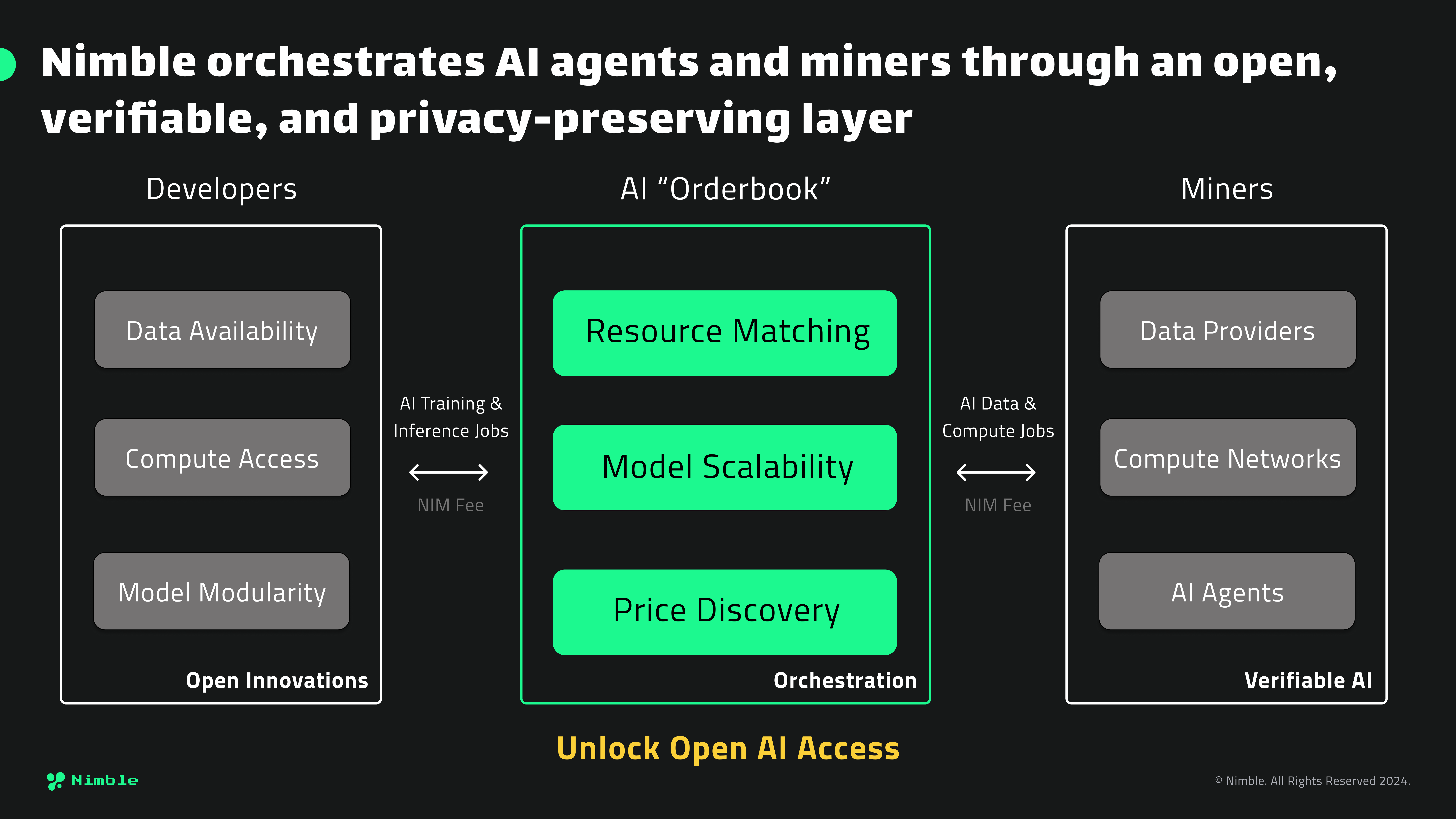 Founded by a team with extensive AI experience from Google, Apple, Facebook, Uber, Instacart, and Robinhood, Nimble aims to enable decentralized enterprise-grade AI for DeFi, Social, Gaming, DePIN applications. Nimble enables developers to leverage models from the world’s AI engineers, data from the public data aggregators, and compute from the globally distributed infrastructure providers to build bespoke applications and custom models with omni-chain access. The protocol is fully decentralized, orchestrated through a native token called NIMBLE.