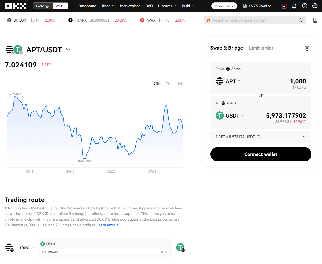 OKX DEX is a DEX (Decentralized Exchange) and cross-chain bridge aggregator. We find the best on-chain liquidity for trading any assets seamlessly. Our X Routing algorithm finds the best price across every DEX.