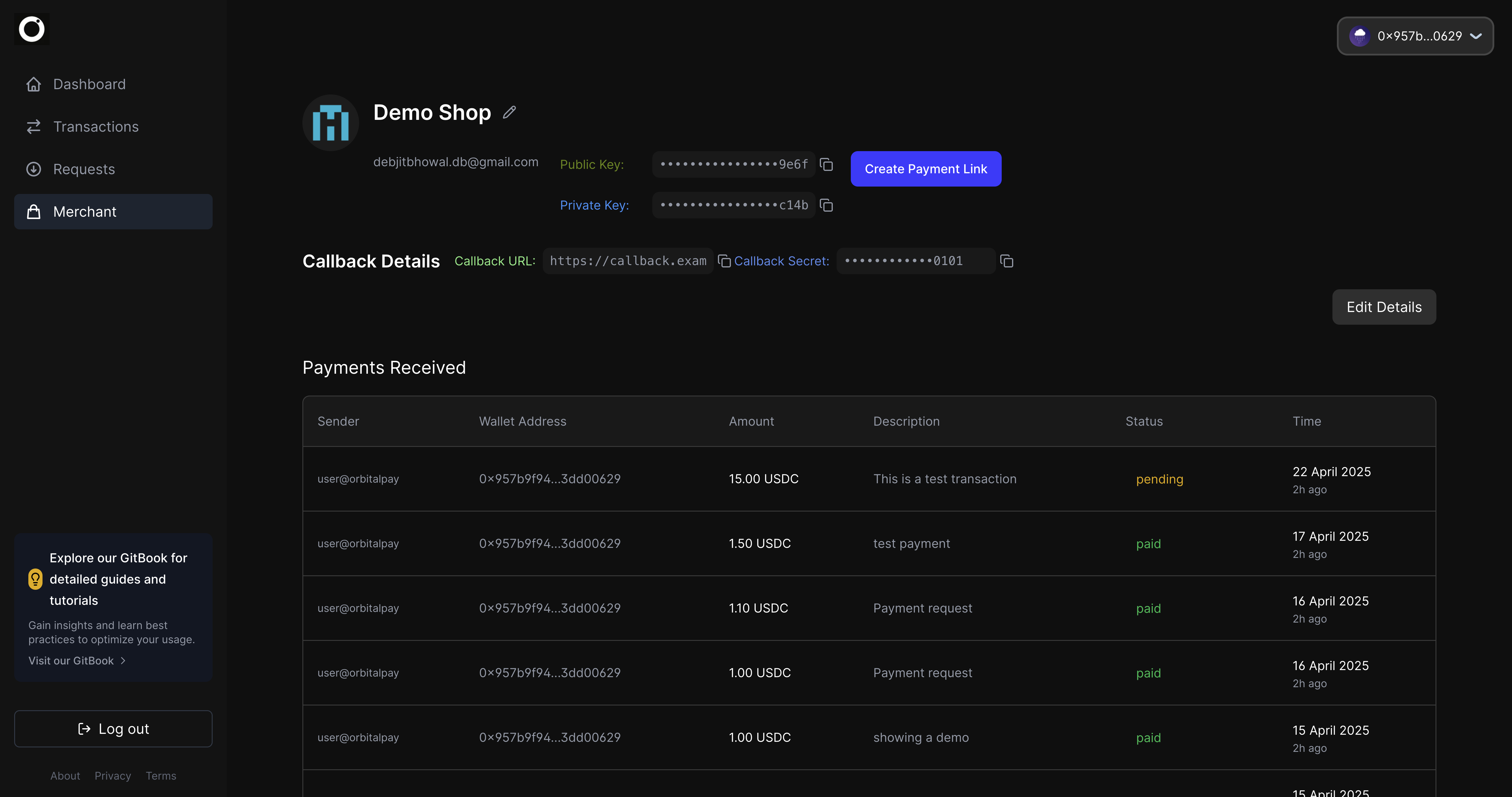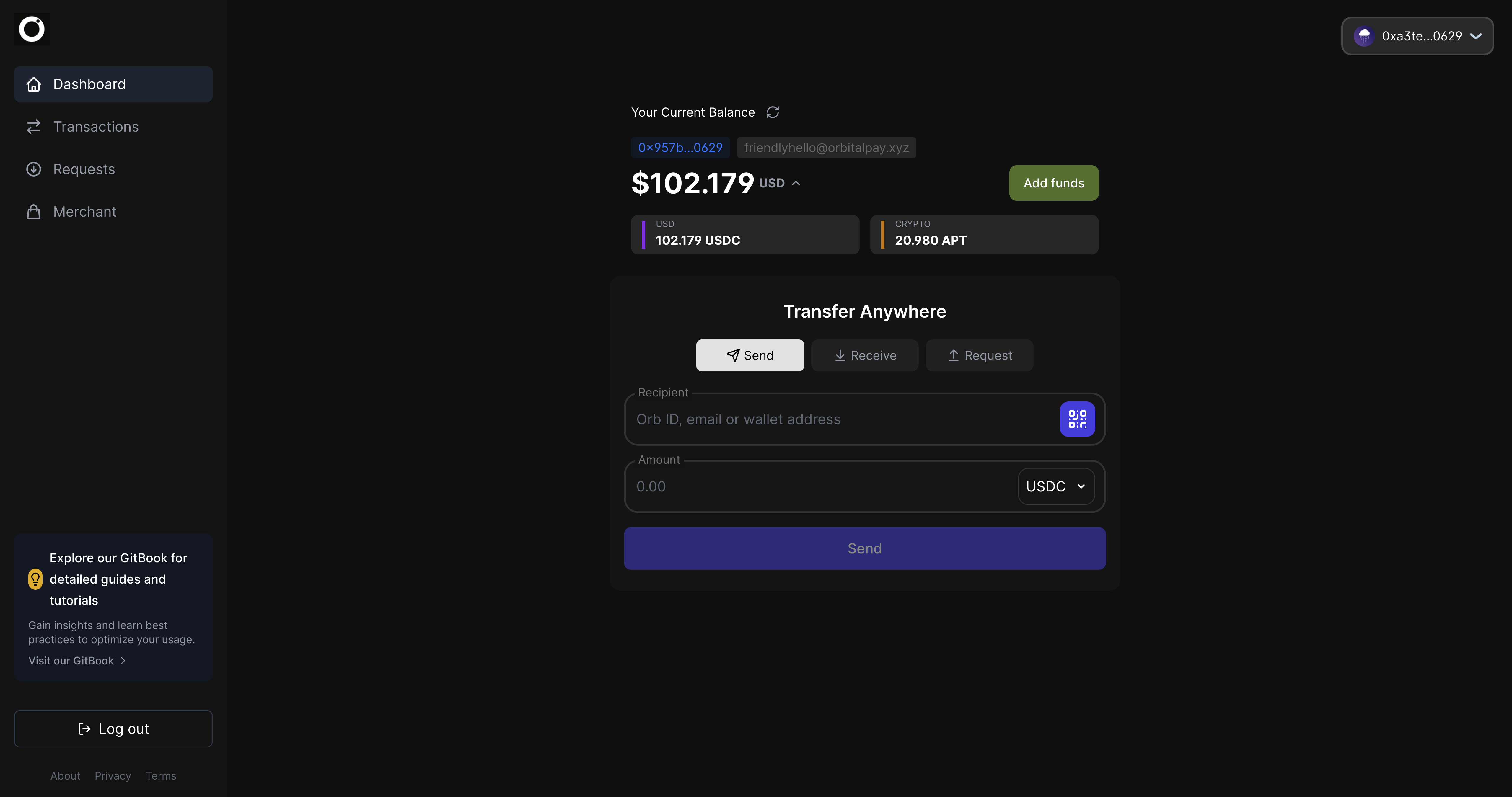 Orbital Pay is a fast, open and decentralized p2p and merchant payments platform. Orbital Pay Gateway lets users checkout from any chain (EVM, Solana, Aptos, Sui) or wallet and merchants get the funds directly in their Orbital account. P2P payments enable you to directly send or request money from contacts using their IDs. Orbital Bridges lets you move funds in and out from other ecosystems with one click.
