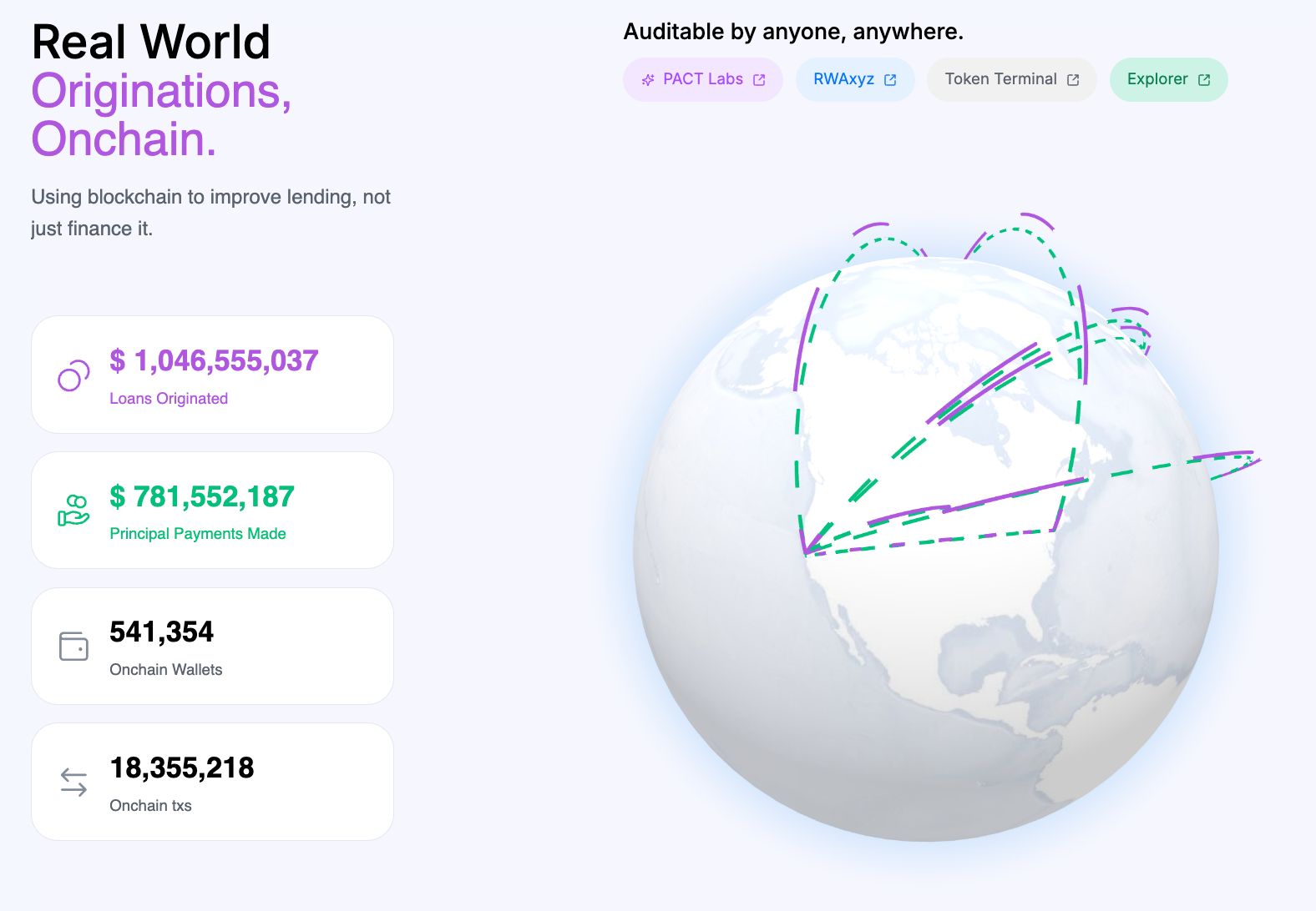Pact Labs is an infrastructure platform transforming on-chain global credit markets enabling the origination, securitization, and servicing of loans across borders with lower costs and greater transparency. Through its permissioned protocol, Pact Labs provides financial institutions with real-time loan data, asset monitoring, automated borrowing base enforcement, and customizable dashboards to manage loans efficiently at scale.