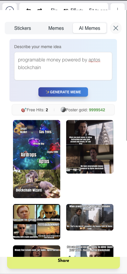 What it does: Poster.fun provides an AI studio for posters and memes with brand safe prompts, style locks, guided templates, and optional logo or watermark lock. Content mints to Aptos in one click with low fees and fast finality. Quests and bounties pay for quality outcomes, not spam. Analytics attribute every asset to its creator, campaign, and share trail. Optional one click animation turns static posters into short social units. Everything writes an on chain IP trail so assets can be licensed, remixed, and rewarded over time.