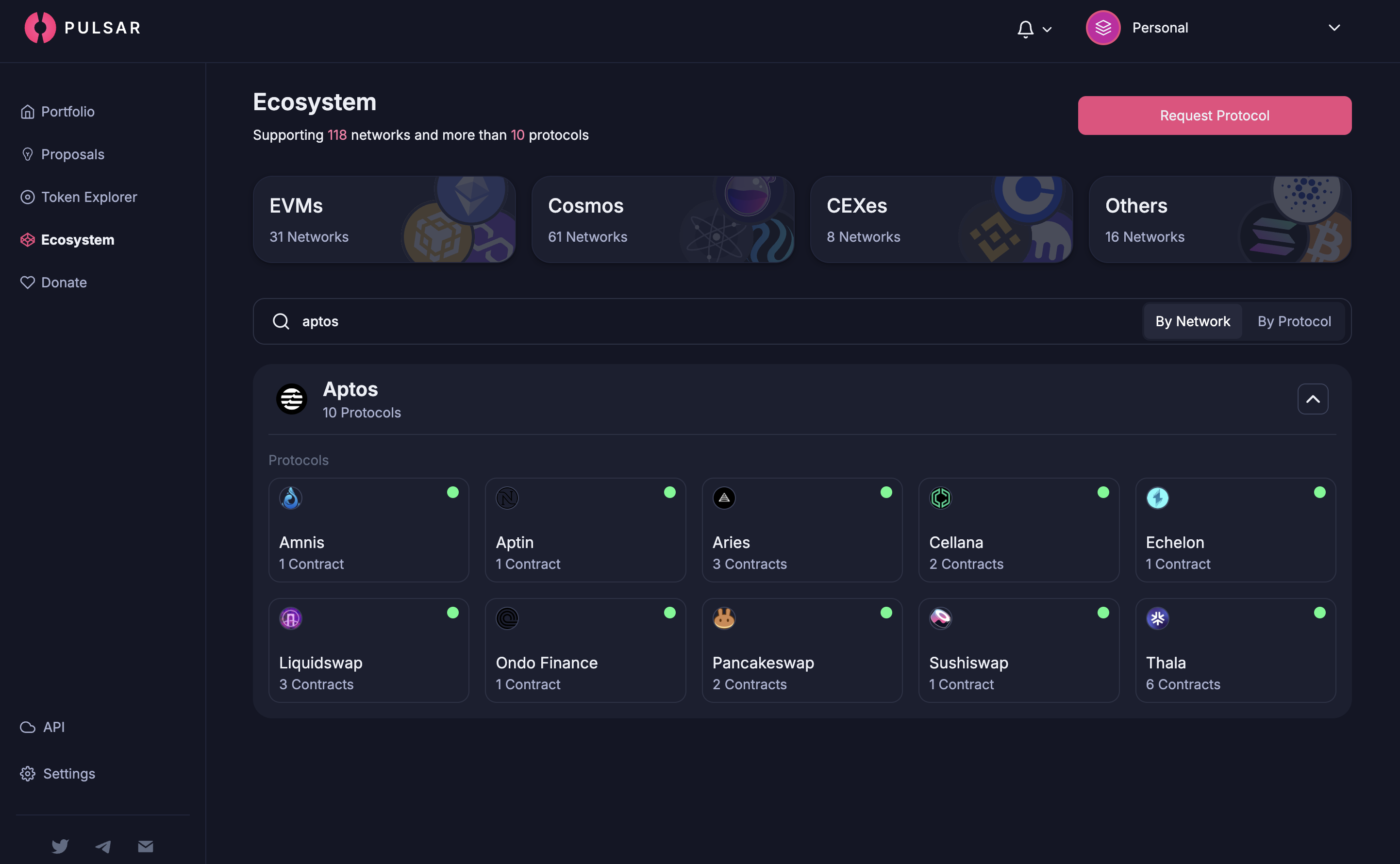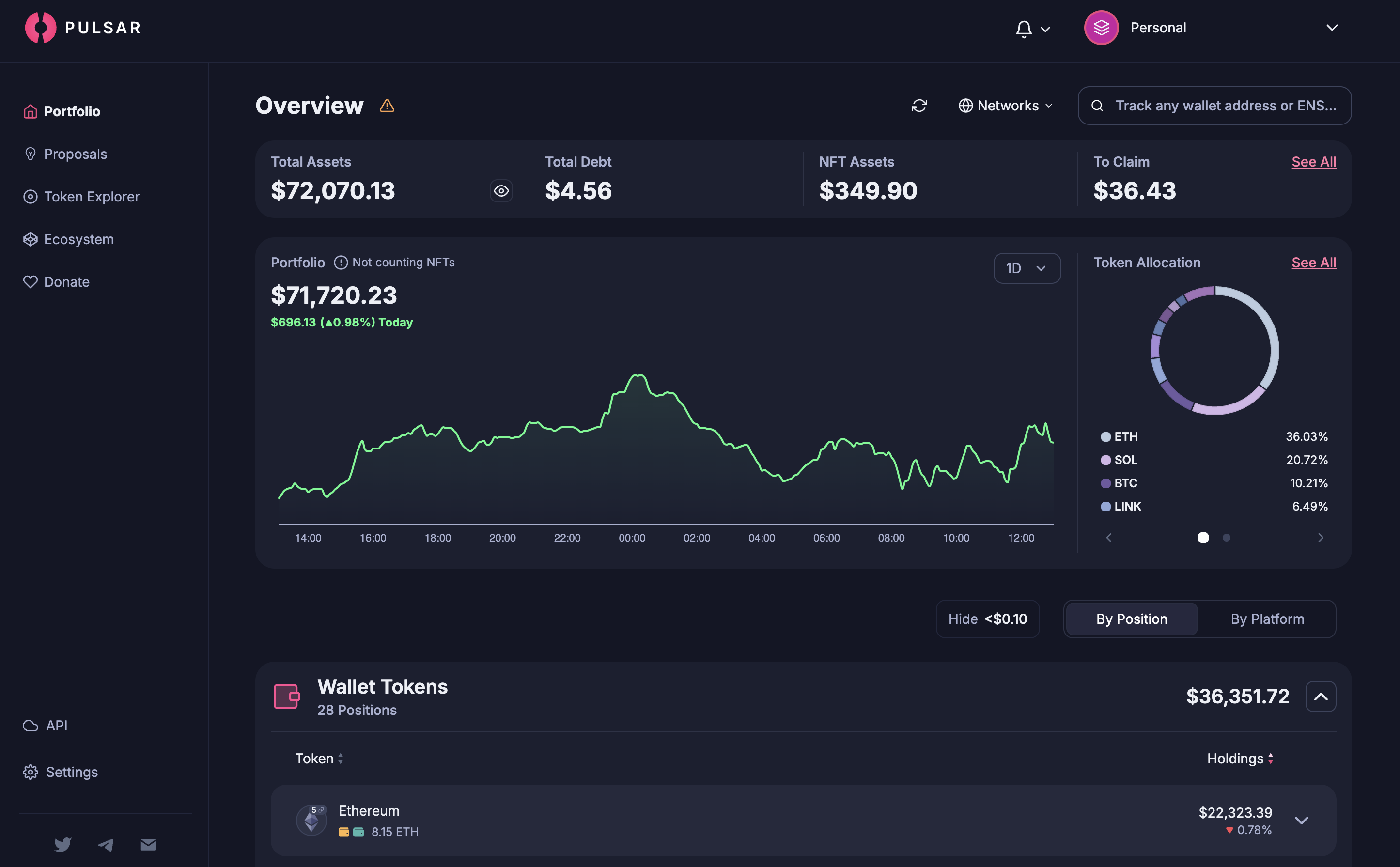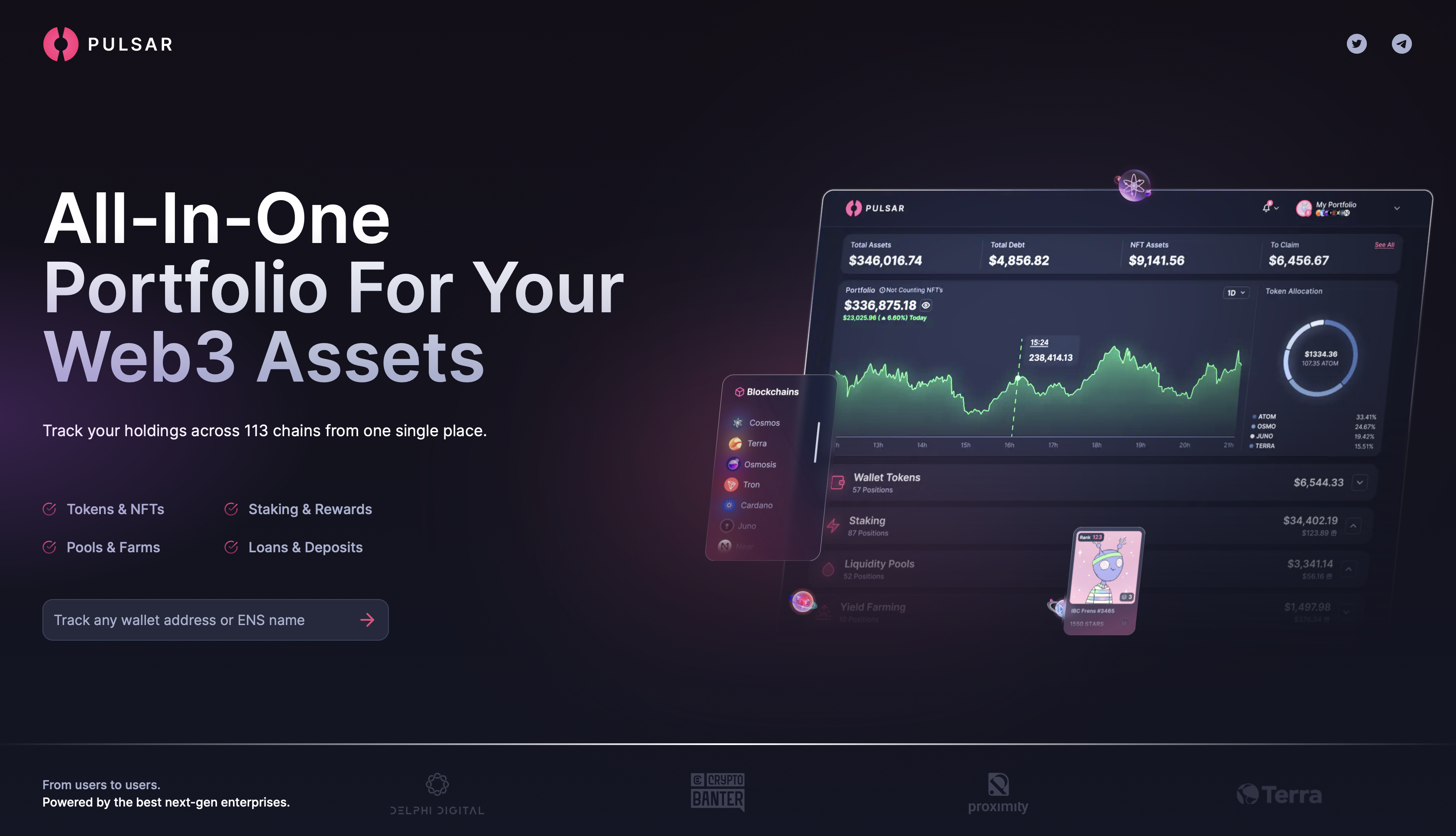 Pulsar Finance is an all-in-one dashboard enabling users to track their assets, DeFi positions and NFTs on Aptos and beyond.
