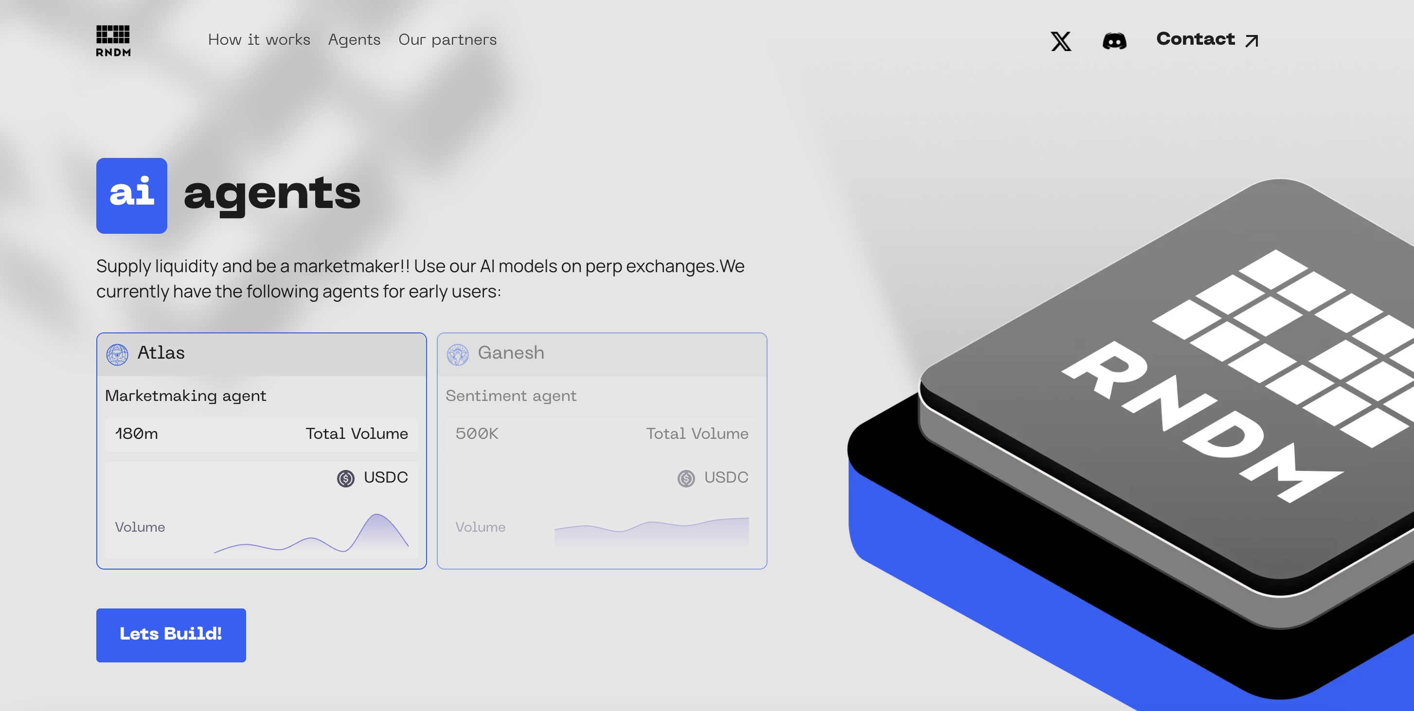 RNDM (RaNDoM) is an AI agent platform for DeFi agents. We are building an AI agent economy to address every DeFi primitive. Using our mix of proprietary AI models, and standard LLM models we offer unique agentic workflows. Each agent will have its own token similar to platforms like virtuals. Each agent token will be fair launched with 10% locked for RNDM token holders via bonding curve, and the rest is available to the Community+Treasury. This method also allows unique Agentonomics where other L1/network tokens can be a part of the bonding curve.