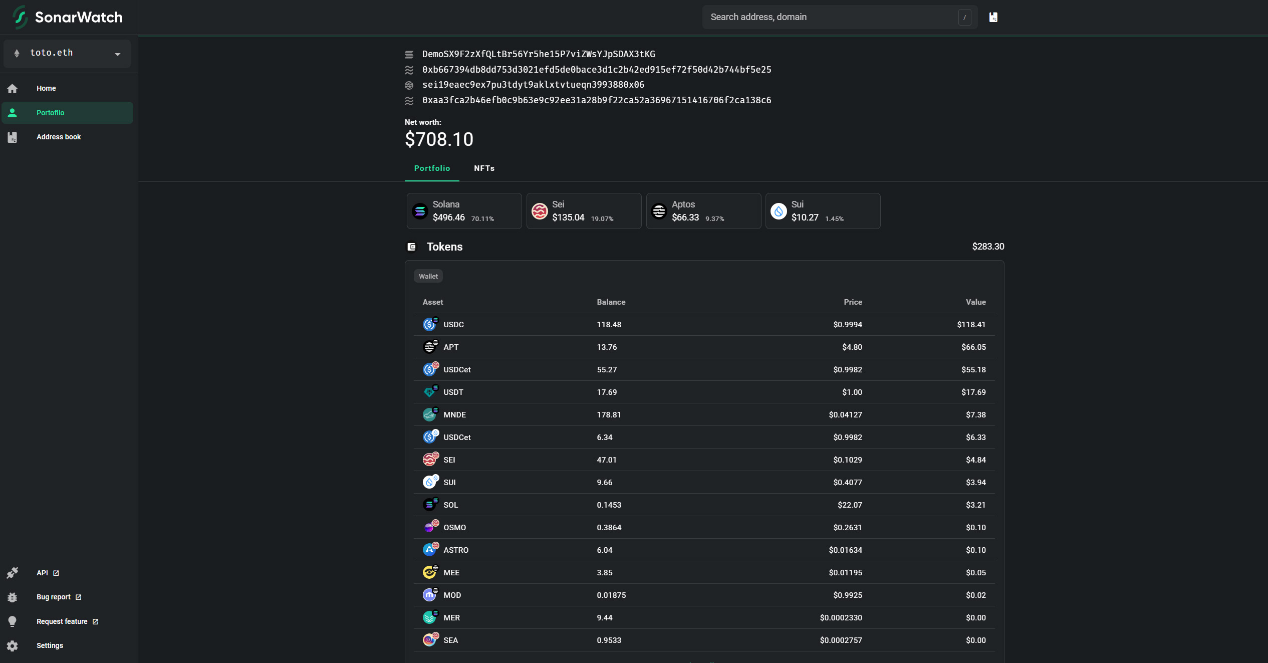 SonarWatch is a multichain dashboard that supports you in monitoring your DeFi portfolio and staying updated on the web3 ecosystem in real time.
