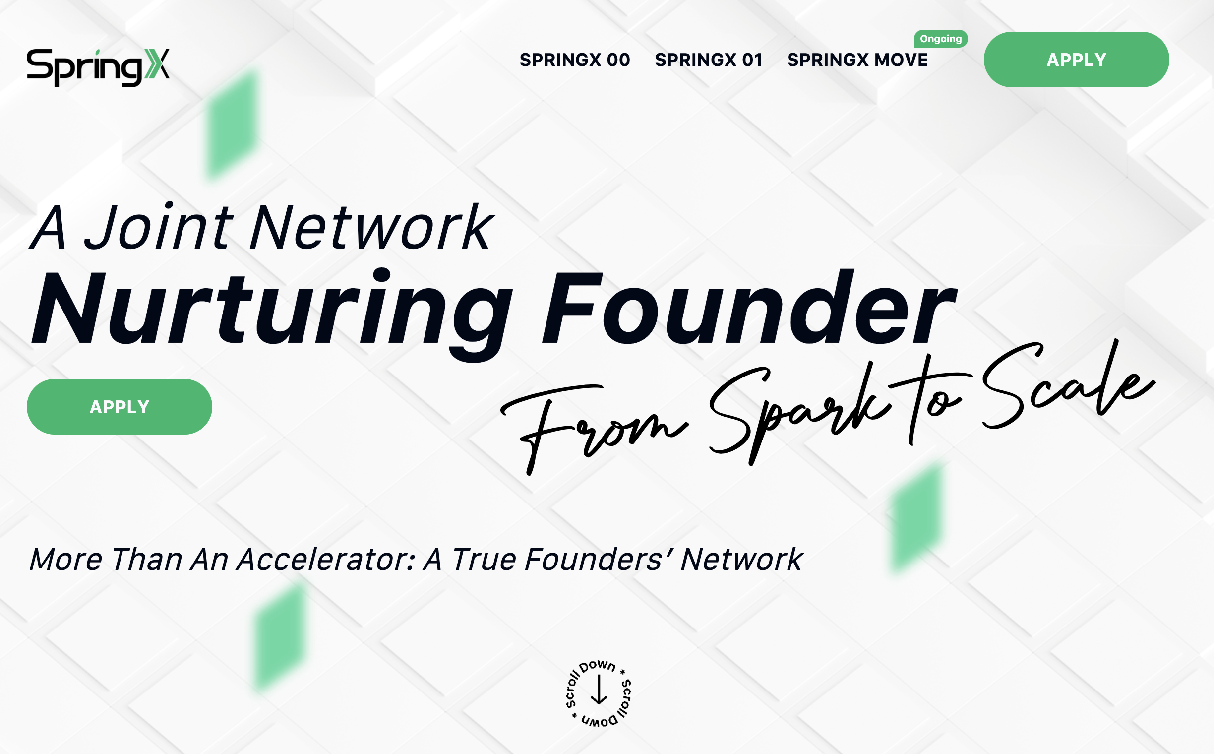 SpringX is a Web3 startup accelerator jointly initiated by BuidlerDAO and 3 leading venture capitals (SevenX Ventures, Bixin Ventures and Generative Ventures) with $20M fund and an alliance of 14 top-tier projects (Galxe, Cybcerconnect, Dodo, Conflux, etc.). Its primary mission is to fuel the growth of early-stage entrepreneurs by providing them with essential funding, comprehensive educational modules, a dynamic network of founders, and a wealth of robust resources. All of these are delivered through a meticulously planned, 3-month offline event.