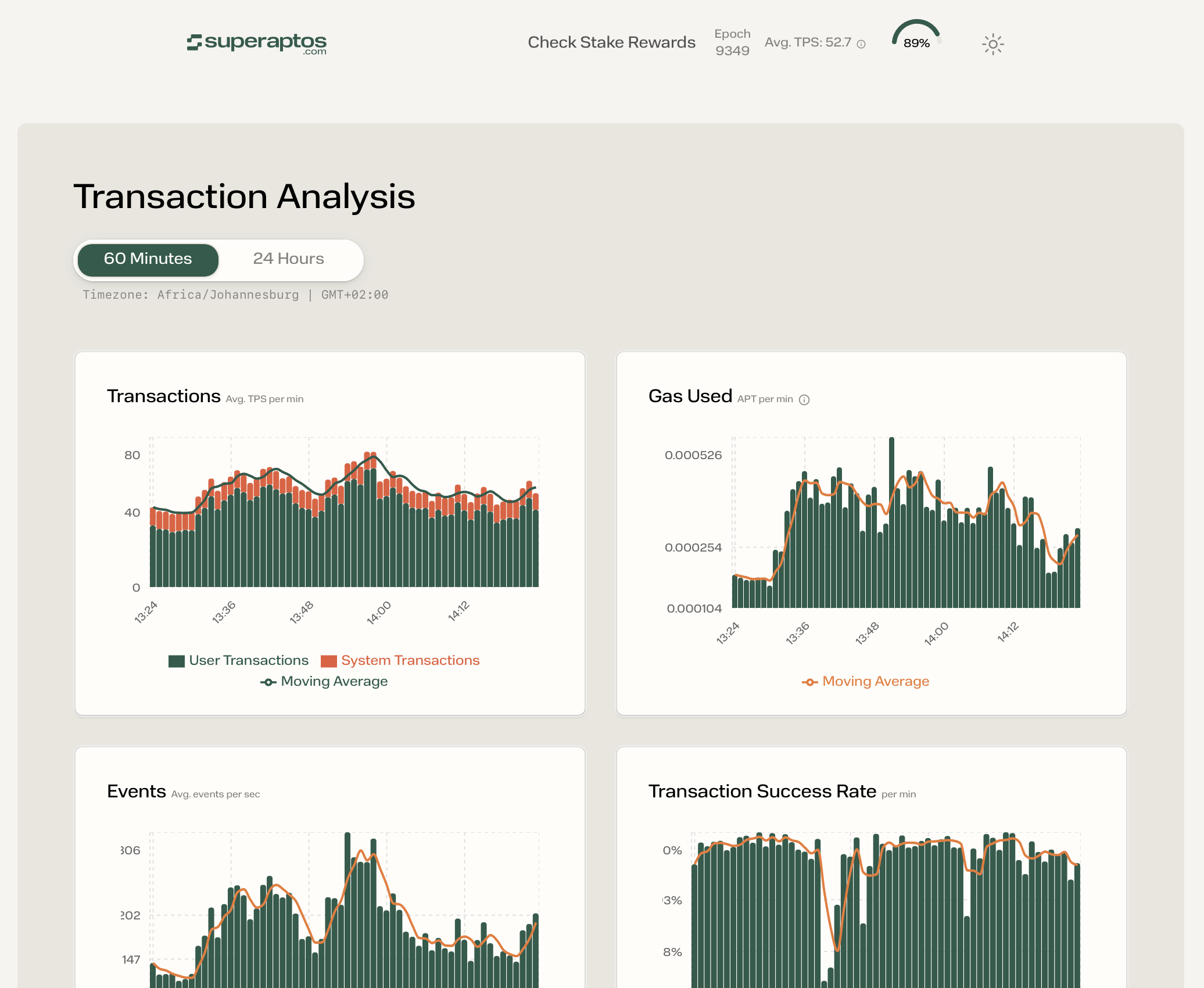 The first real-time analytics dashboard displaying network statistics and validator health metrics. Powered by the Superfast Validator.