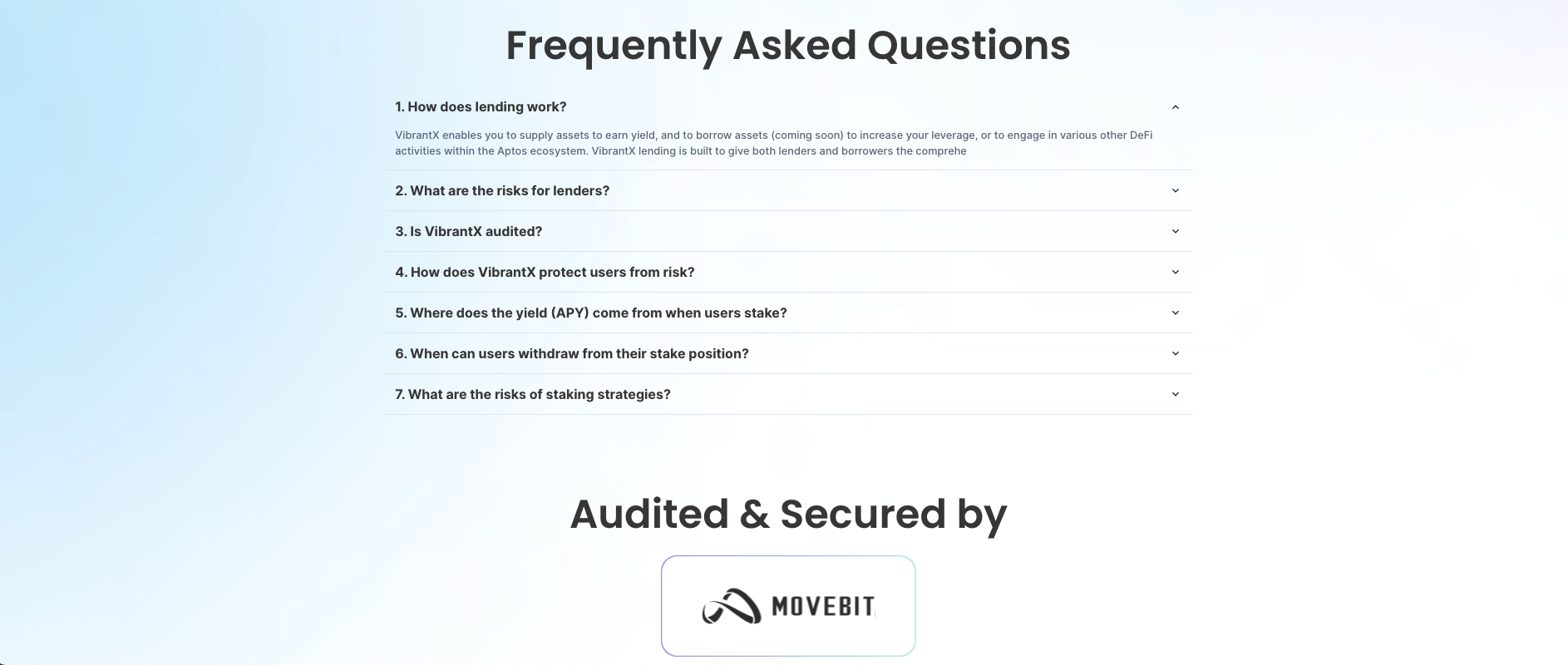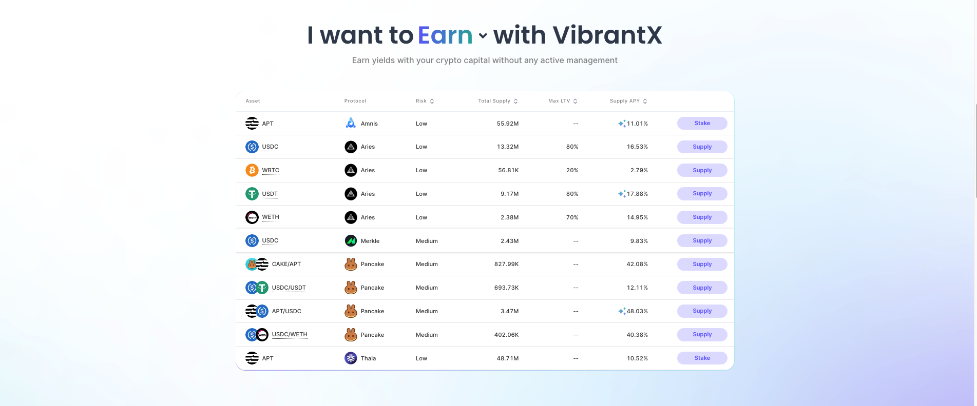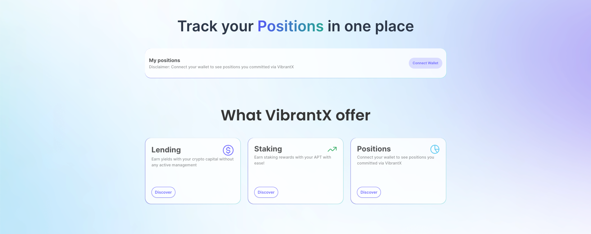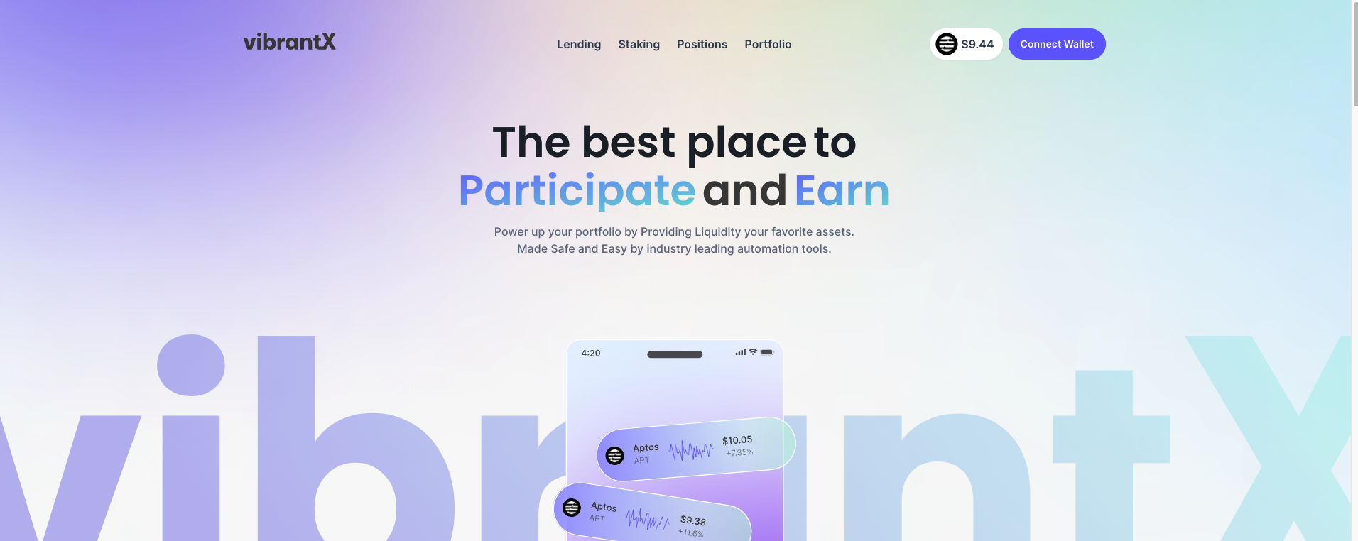 VibrantX is positioned as the front page of Aptos, committed to becoming the premier one-stop-shop platform, ensuring a seamless onboarding experience for Non-Defi users. VibrantX provides Yield Optimizer and Portfolio Management dashboard designed to enable users to navigate multiple safe and efficient yield earning strategies within the Aptos Ecosystem.