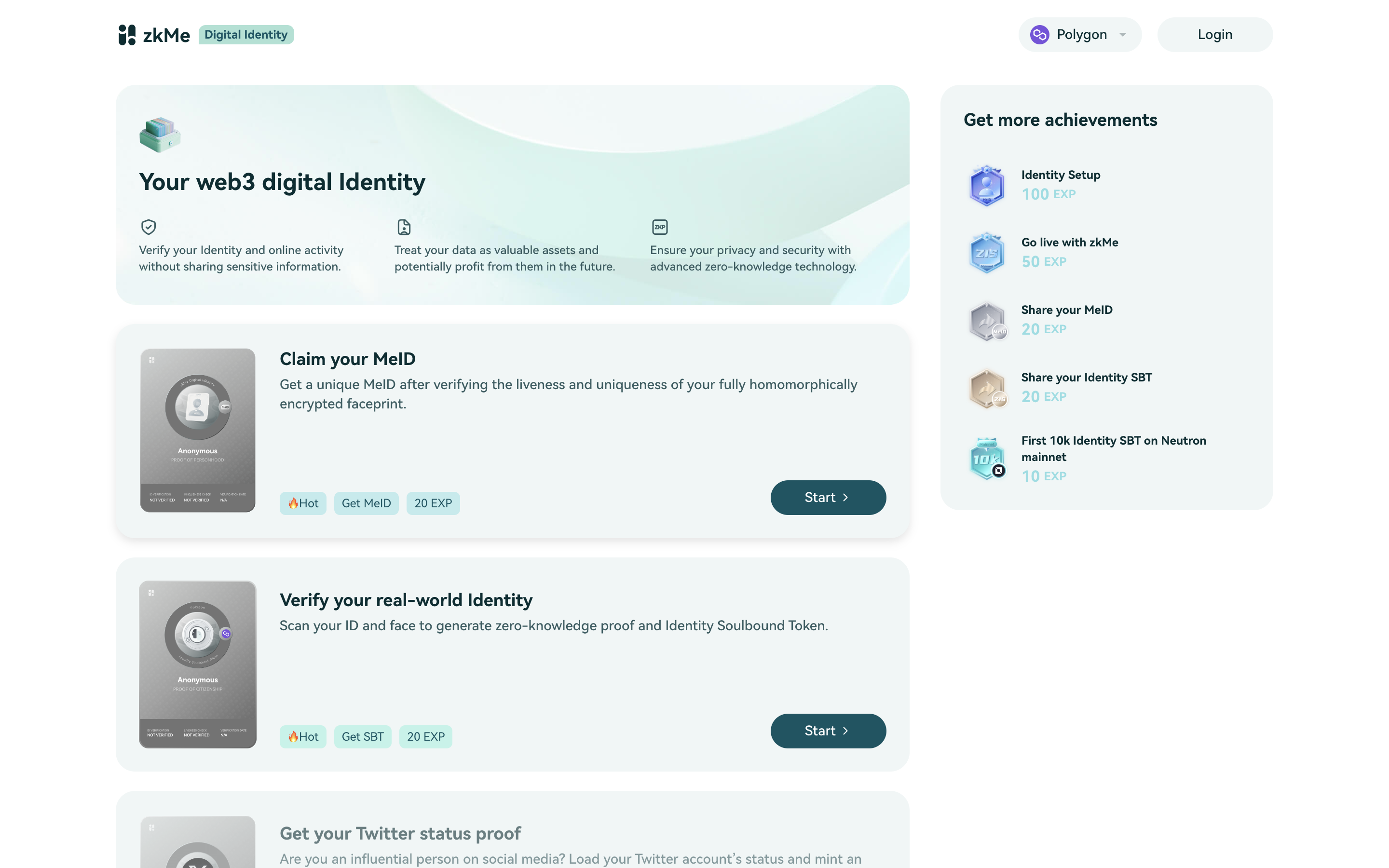 You, privately verified. zkMe verifies user credentials without disclosing any personal information to anyone. Through the use of innovative zero-knowledge proof technologies, it is the only KYC solution to be fully decentralized, private-by-design and compliant with global AML requirements. zkMe helps to keep the ethos of Web3 in regulated crypto businesses.